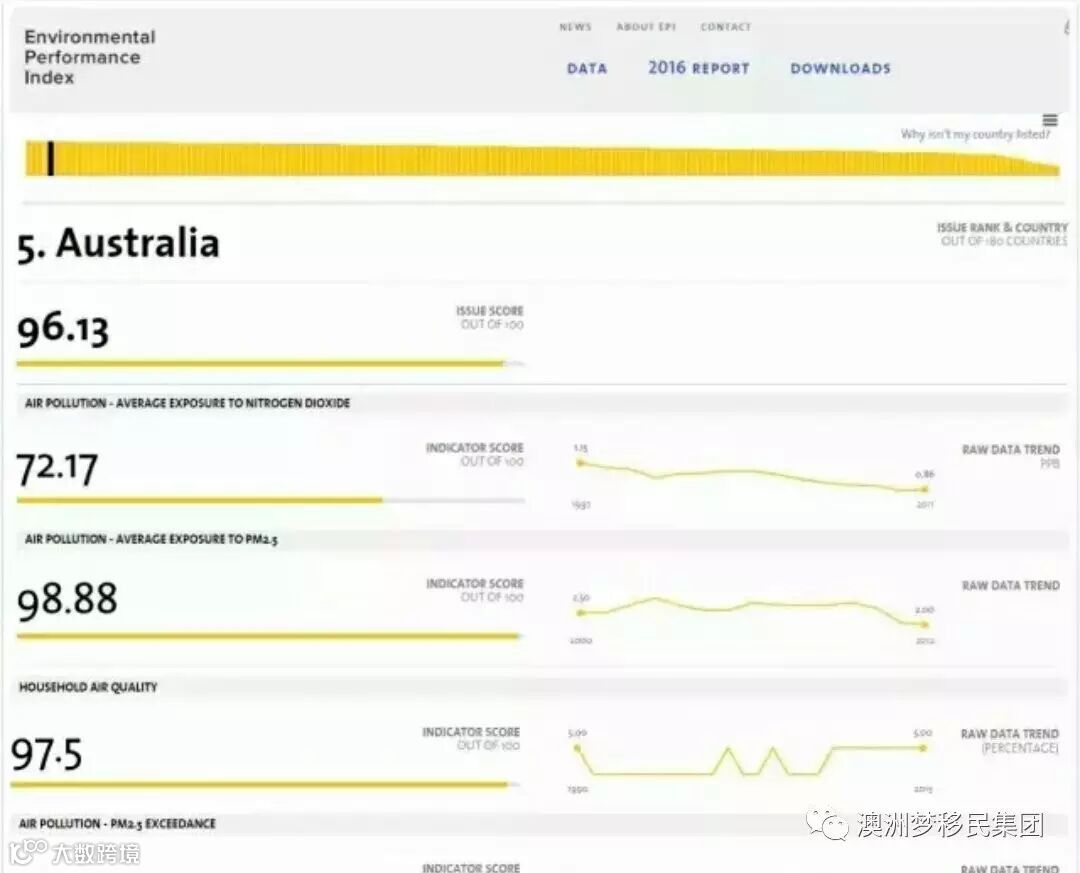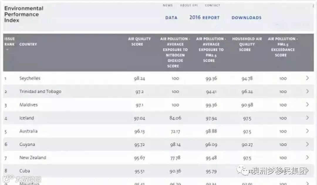 根据美国耶鲁大学2016最新环境绩效指数EPI(Environmental Performance Index)排名中,澳大利亚在全世界180个国家空气质量榜单中排名第五,位列塞舌尔群岛、加勒比岛国特立尼达和多巴哥、马尔代夫群岛和冰岛之后。前几名均为旅游胜地和岛国,作为经济发达地区,澳大利亚获此殊荣实属不易!
