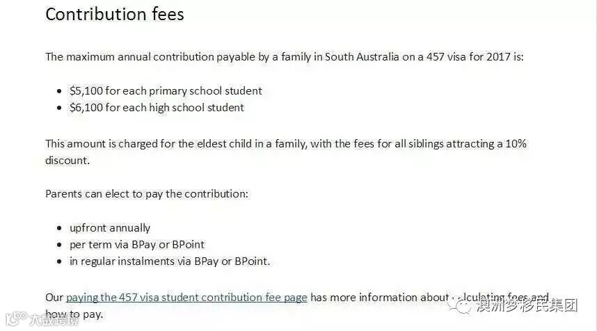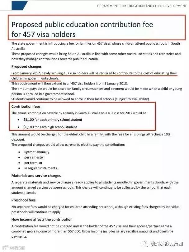 南澳政府进一步证实,一年后自2018年1月1日,该州所有457签证持有者的子女都不再享有免费教育的待遇。457签证持有者家长需支付contribution fee小学每人每年5100澳元学费,中学每人每年6100澳元学费,多子女家庭,年龄最长的子女需支付全额学费,其他子女可享受9折优惠。