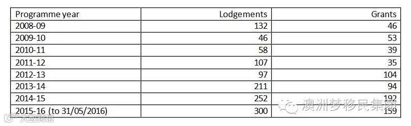 澳洲商业移民签证是于1992年颁布的。最近移民局公布了在过去的4年中澳洲商业创新及投资移民签证的申请及获批数量: