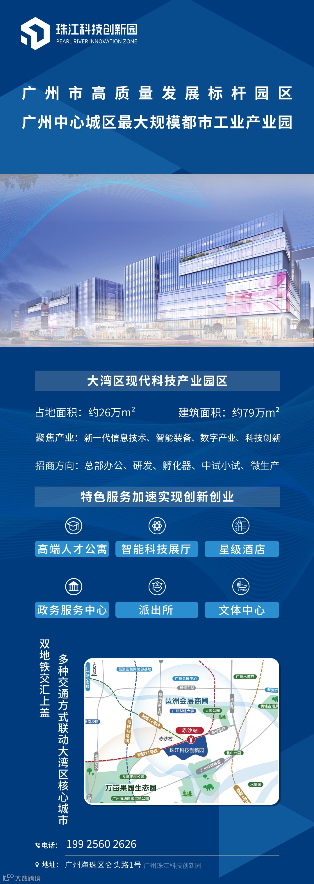 珠江科技创新园位于广州市海珠区新滘东路以南,仑头路以西路段,紧邻万亩果园、海珠国家湿地公园,北临琶洲会展商圈,西面紧靠海珠区政府及中大纺织城。园区总建设用地面积约26万㎡,总建筑面积约79万㎡,计划总投资77亿元。园区是海珠区现存最大规模,也是广州中心城区面积最大的都市工业产业园。广州“十四五”规划重点项目、2024年广州重点建设项目计划、广州市高质量发展标杆园区。园区享受广州市高质量发展标杆园区及海珠区都市工业园区专项扶持政策。