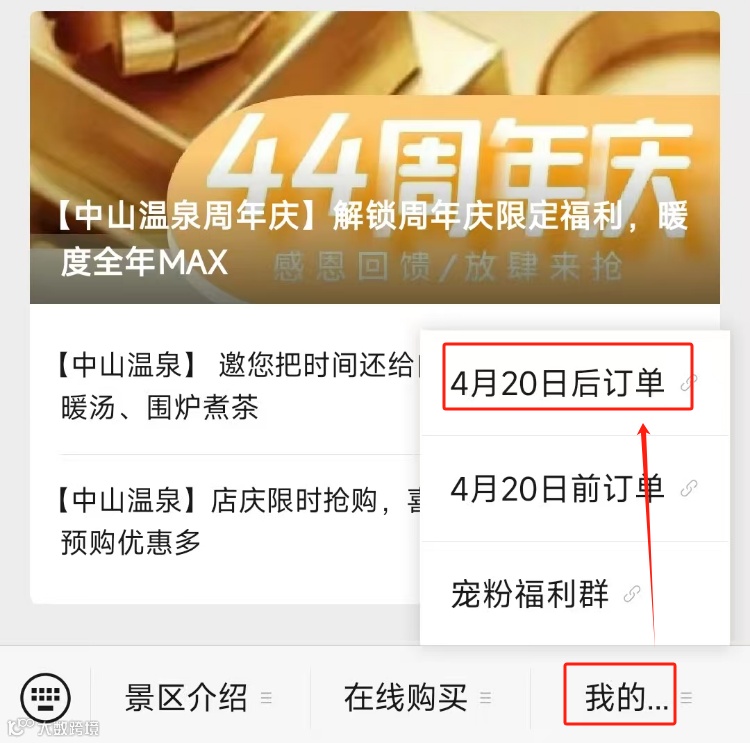 3、优惠券查询方法:关注酒店微信公众号“中山温泉”-“我的”-“4月20日后订单”-"优惠券"