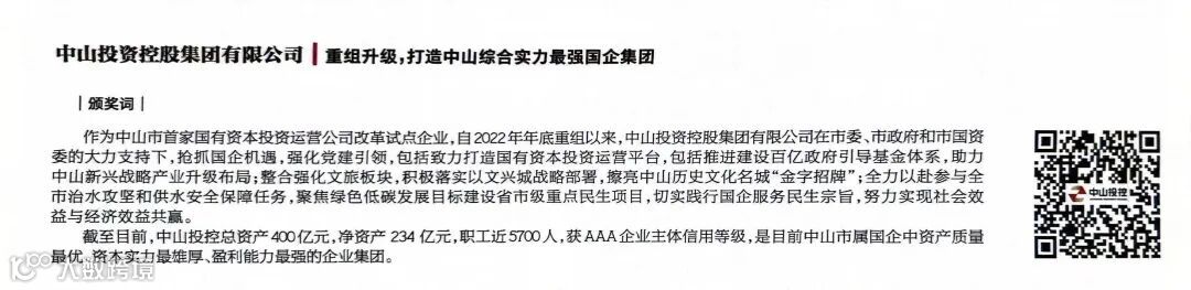 截至2023年底,中山投控资产总额突破400亿元,当年营收、净利润实现双位数增长,规模、效益取得双丰收。数字背后是用实劲、出实招,2022年成功重组后,中山投控以“投控一盘棋”理念打造“强总部、强管理”,内选外引人才300余人,通过“强考核、强激励”重塑干事创业氛围,形成岗位价值导向的薪酬机制,建立企业文化VI体系和“行远道、共成长”品牌体系,高质量发展的基本盘初步稳固、综合能力稳步攀升。
