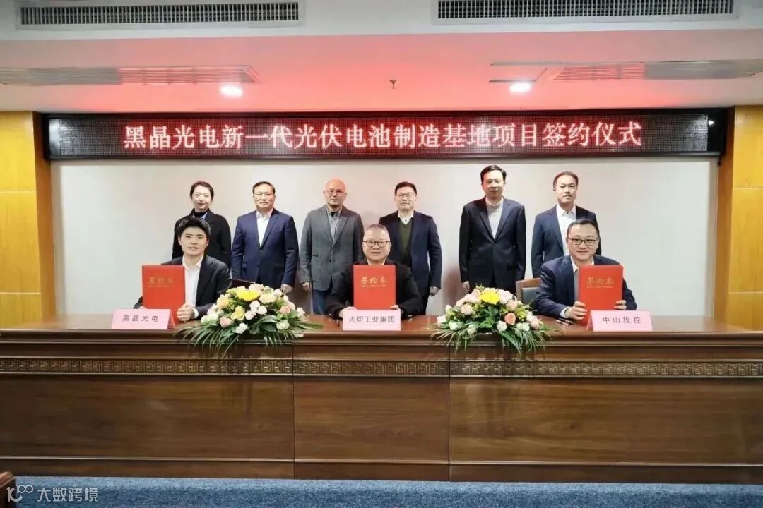 1月30日,深圳黑晶光电技术有限公司、中山市投资控股集团有限公司、中山火炬工业集团有限公司在中山火炬开发区管委会举行了三方签约仪式,全国首条量产化钙钛矿/晶硅叠层光伏电池生产线项目(下称“黑晶项目”)落户中山火炬开发区。