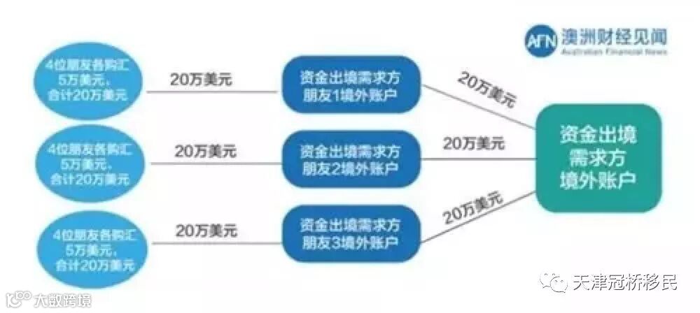 需要向海外转移资金的需求方请三位亲友分别在境外开设银行账户,三位亲友再分别邀请四位朋友(避免法规中不得超过5人的监管要求)各购汇5万美元以下,总金额不超过20万美元,汇到三位亲友的境外银行账户,这样一来,三位亲友每人境外银行账户中都可以累计近20万美元,合60万美元。再将三个境外银行账户中的60万美元转移到需求方海外账户,便可用于海外投资之用。