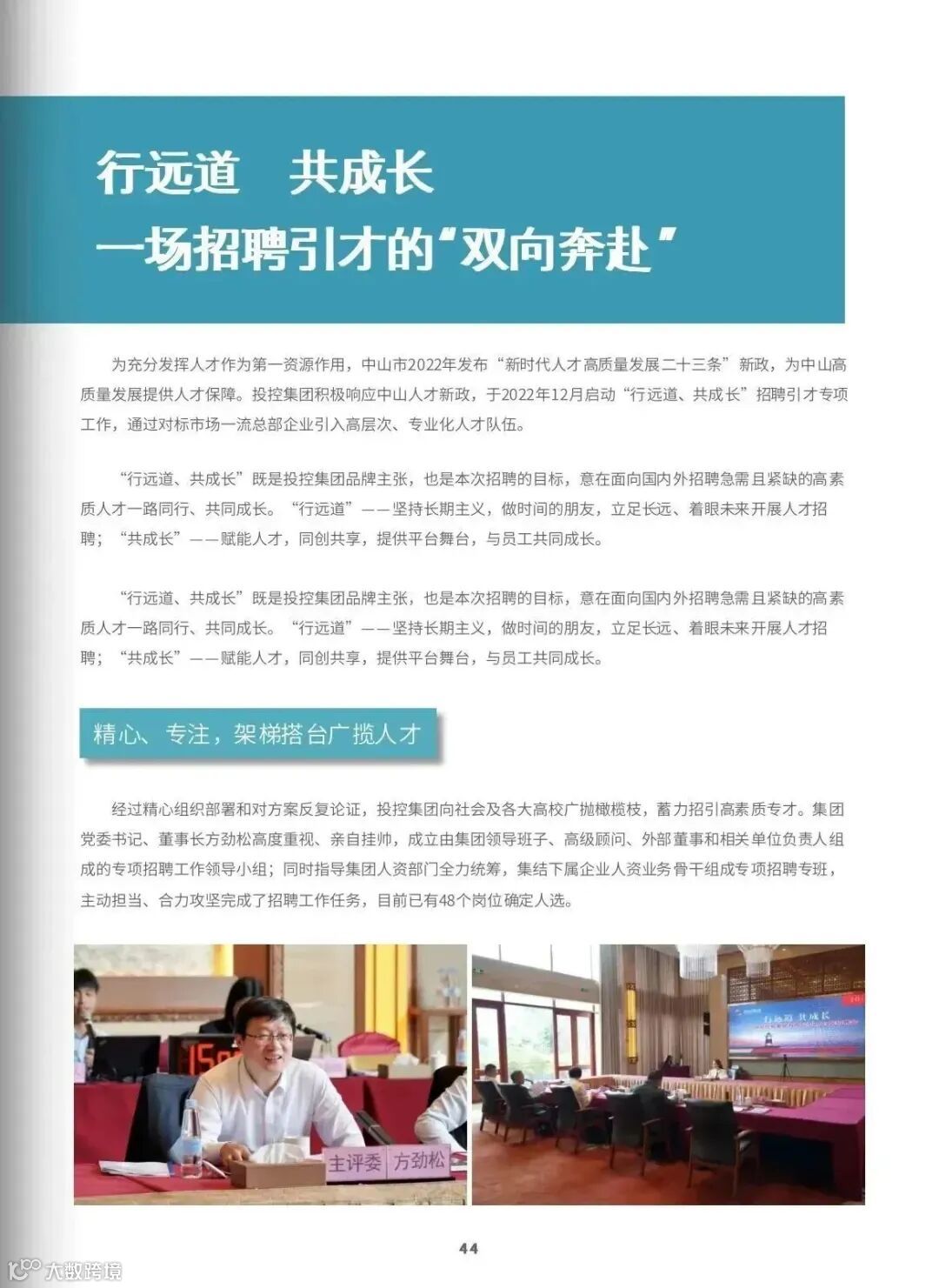 开发人才,投资未来。本期内刊的员工风采板块里,收录了投控集团2023年招聘引才工作的专题报道,记录了“公用学堂”的正式开办,采访聆听了多位投控青年的工作心得体会,见证发展新起点之上,投控集团正在成为各类人才创新创造、大有可为、大有作为的热土,一幅“千里马”竞相奔腾的创业画卷正徐徐铺展。
