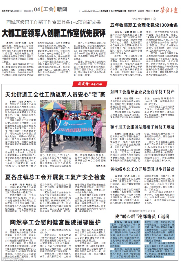 本报讯(通讯员 杨鑫)“老田,你到达北京了吗?集中隔离环境怎样?”近日,在中铁物贸北京公司“欢迎回家”微信群中不时传来关切的话语,这是该公司工会为湖北返岗员工专门组建的微信群,在及时掌握湖北籍员工健康状况外,也让员工们感受到家一般的温暖。
