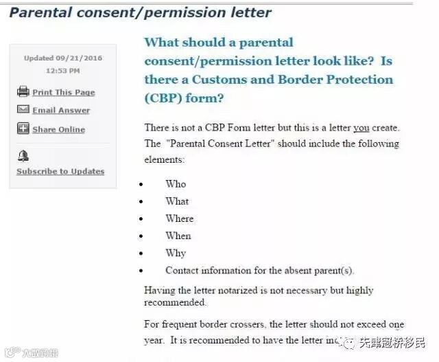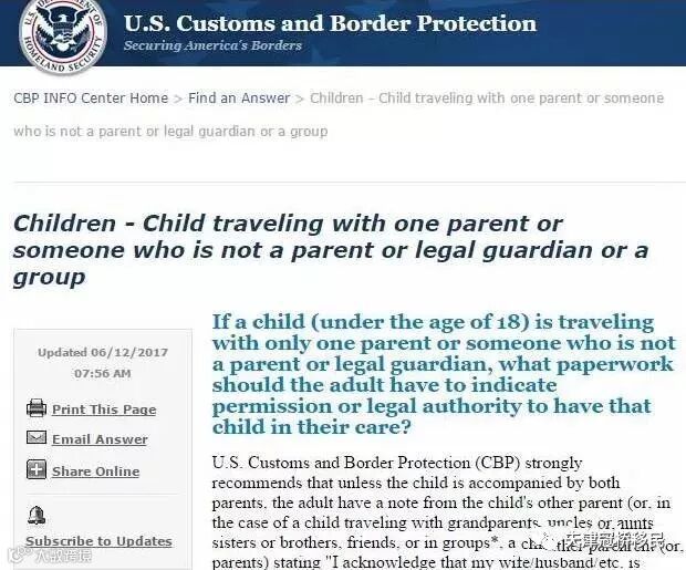 美国海关及边防保护局建议,建议公证父母授权信,同时提醒,对于经常出入境的人来讲,这封信有效期最好不要超过一年,并且最好由英文填写。