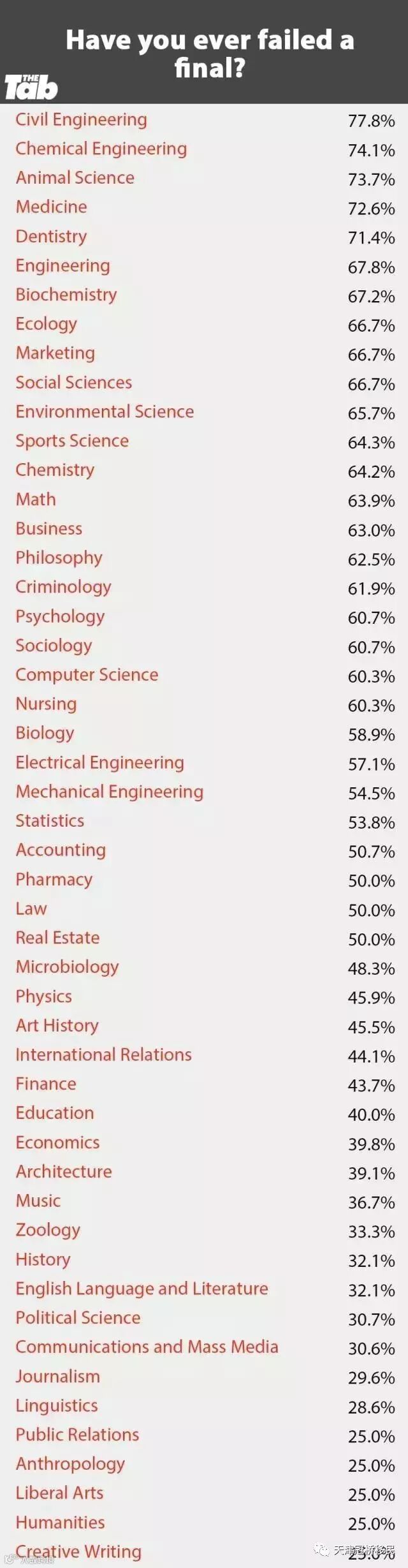 根据来自印第安纳大学的调查显示,工程、医学等理工科生最容易挂科,像土木工程这类STEM专业的学生面临更大的压力,挂科率要超过75%。