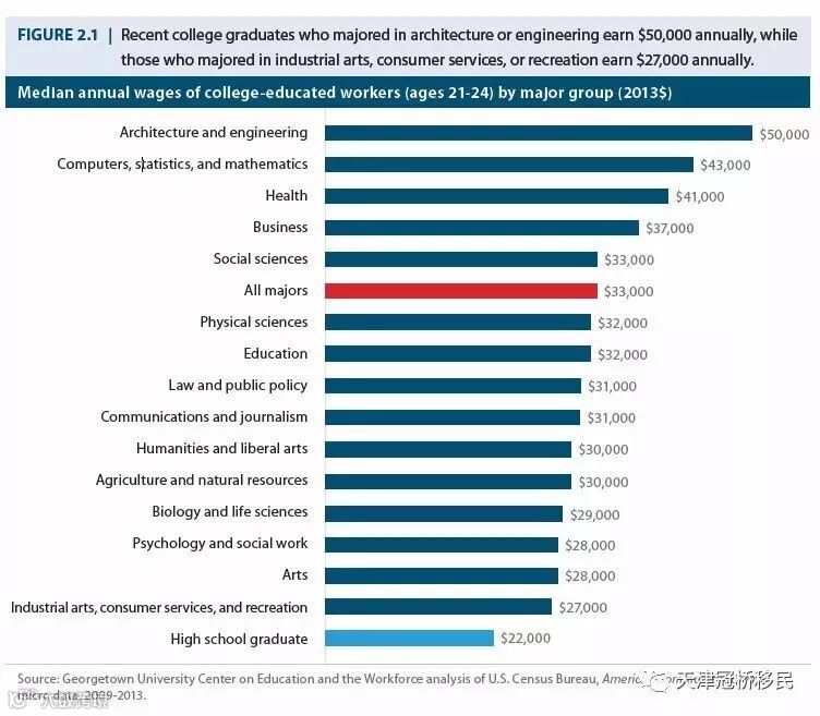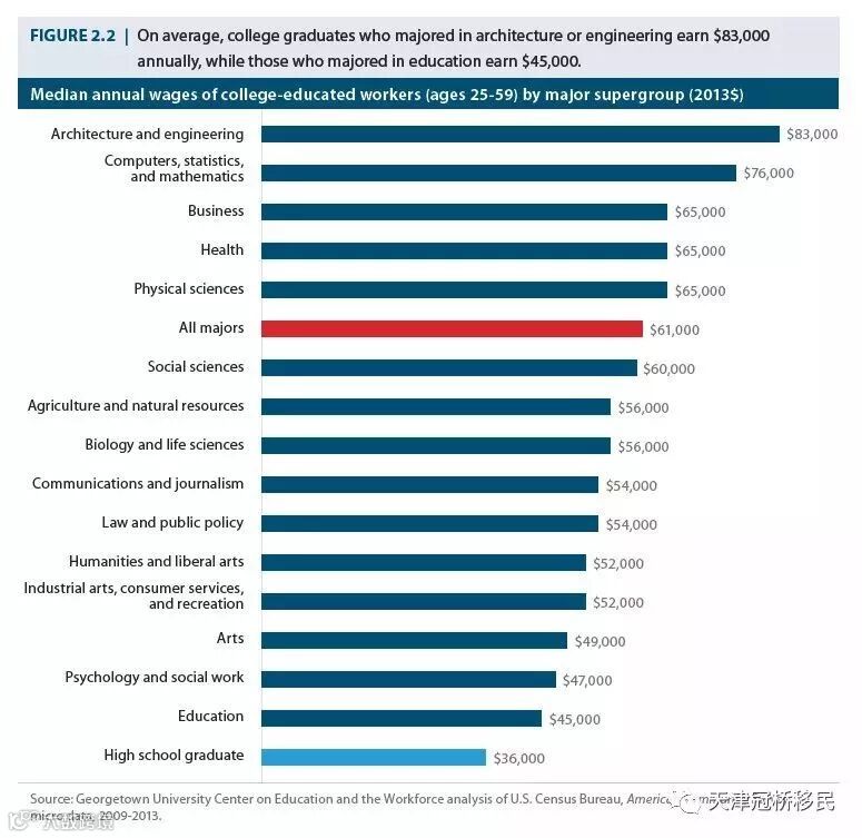 对于刚毕业不久的大学生来说,就业起薪最高的是建筑和工程大类的专业,平均年薪50,000美元(缺点:失业率也更高)。其次就是热门的计算机类专业、健康类专业和商科,它们的平均年薪分别是43,000美元、41,000美元、37,000美元。除此以外,拥有本科学历的毕业生,它们的收入相比较于高中学历毕业生大约多出100万美元。