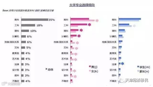 可以看出,很大一部分留学上选择了商科(占35%,女生多于男生);其次是工科(占18%,男生居多);排名第三和第四的分别是理科和计算机专业;传媒/国际关系位列第五。