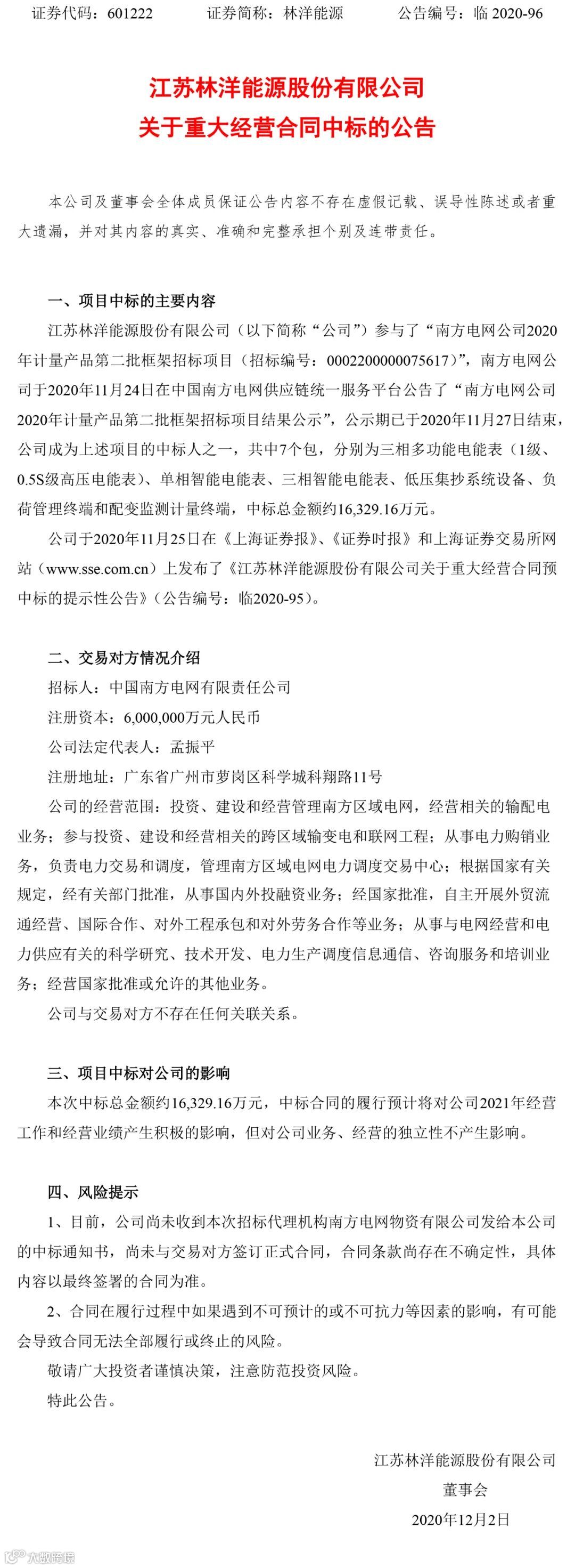 林洋能源中标南网1.63亿元计量产品项目
