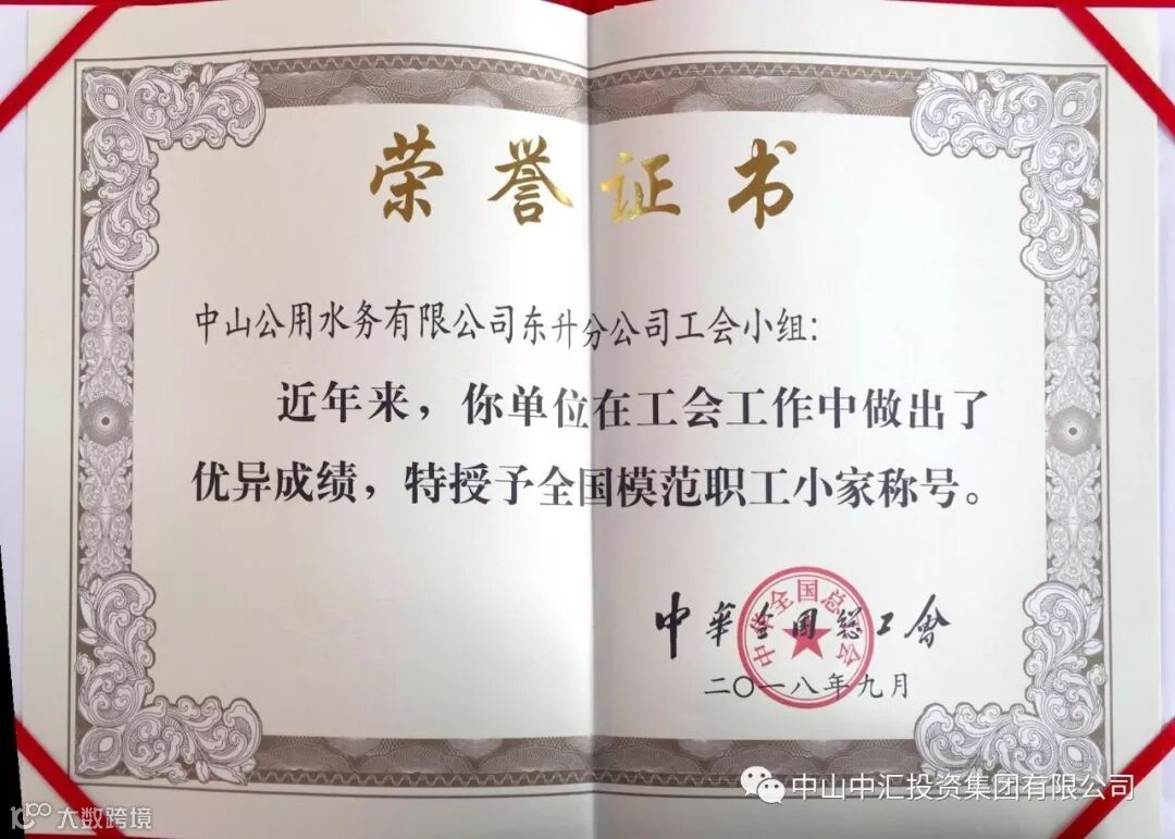 2019年1月29日,在中山市总工会十五届八次全委(扩大)会议上,市总工会代中华全国总工会颁发了全国模范职工之家、模范职工小家、优秀工会工作者、优秀工会积极分子奖项。其中,中汇集团工联会下属中山公用水务有限公司东升分公司工会小组在服务职工、加强职工小家建设、激发基层工会活力方面表现突出,得到广东省总工会和市总工会的充分肯定与推荐,喜获“全国模范职工小家”光荣称号。这是中山公用水务有限公司东升分公司工会小组继2016年12月获得“广东省级模范职工小家”称号后获得的国家级殊荣,2018年度全市仅有三家工会小组荣获此奖项。