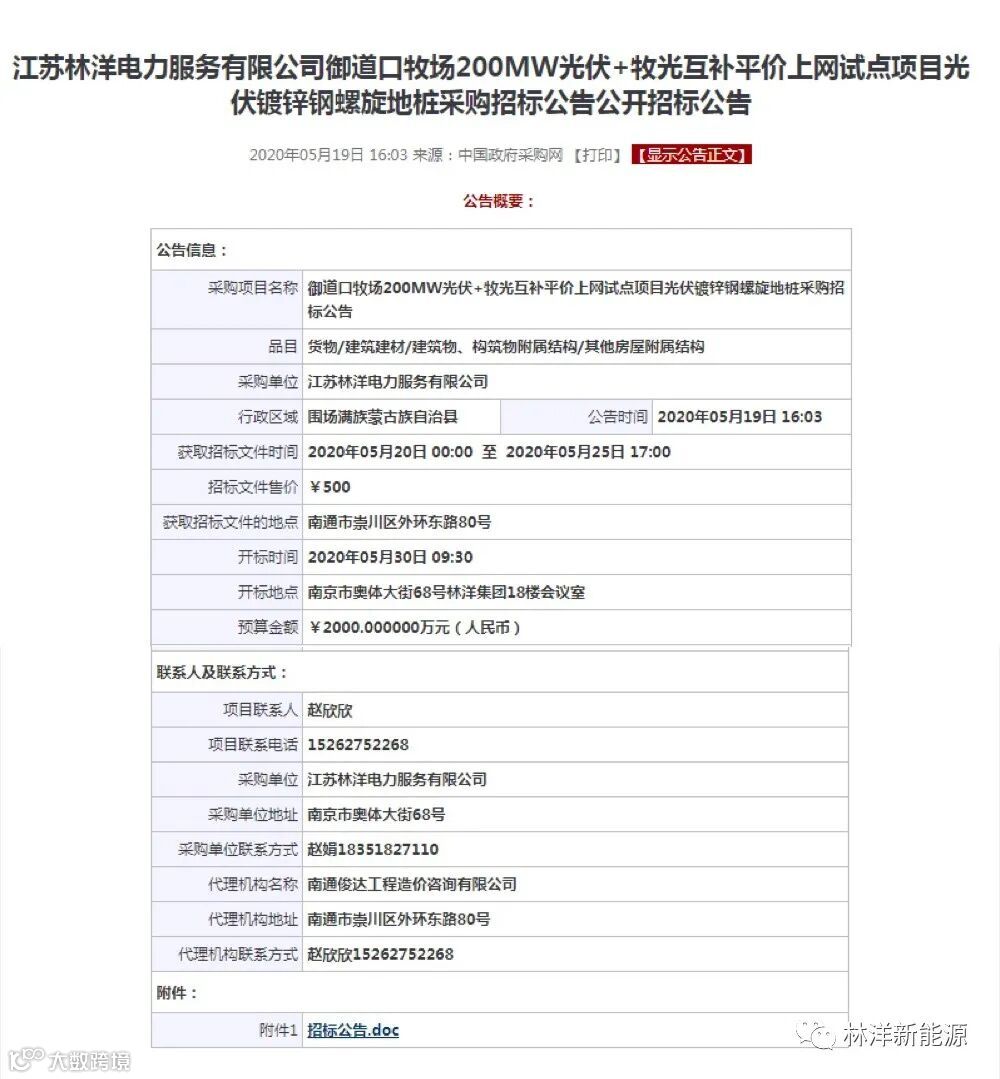 御道口牧场200MW光伏+牧光互补平价上网试点项目光伏镀锌钢螺旋地桩采购招标公告