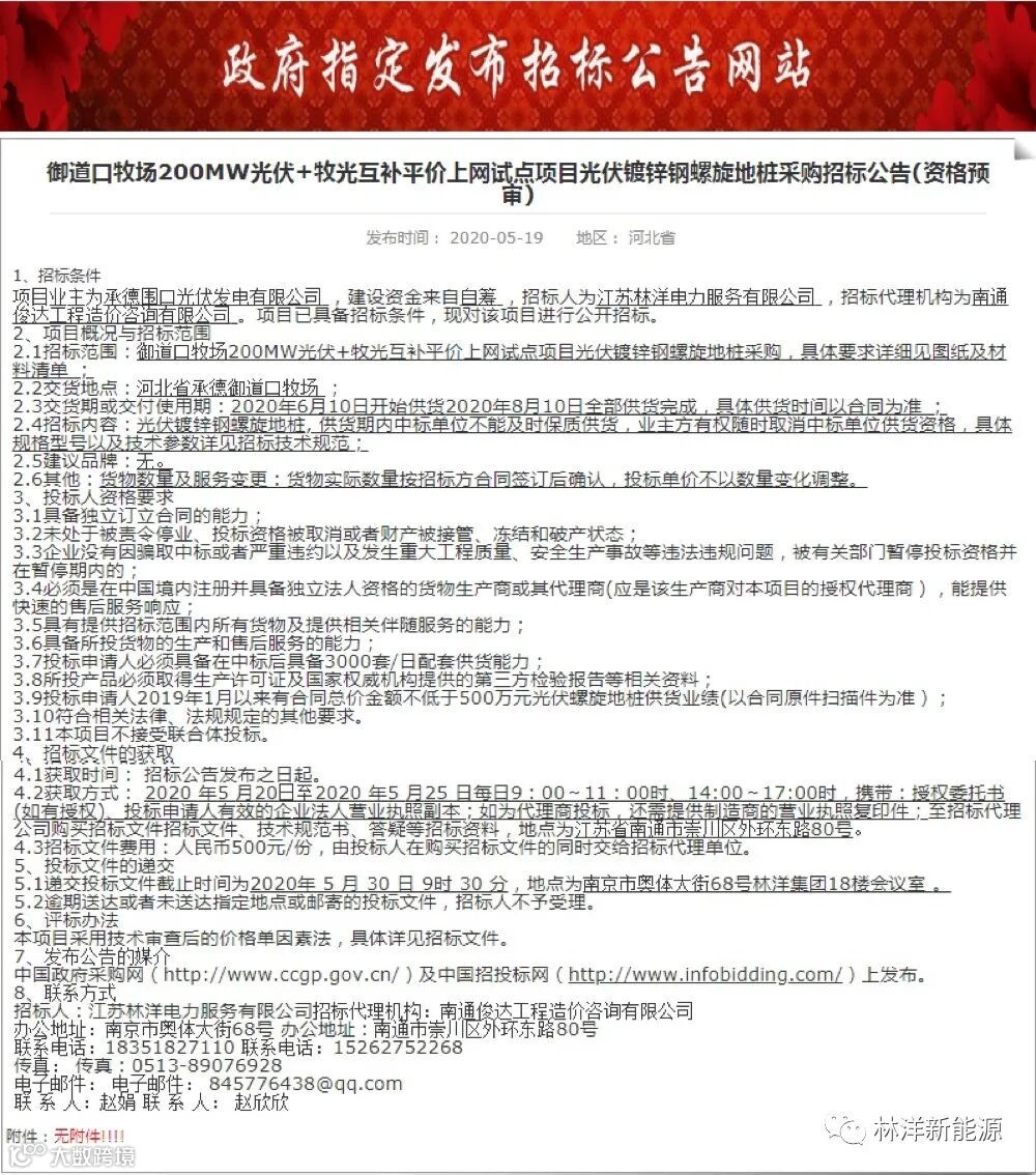 根据《中华人民共和国政府采购法》等有关规定,现对御道口牧场200MW“光伏+”牧光互补平价上网试点项目光伏镀锌钢螺旋地桩采购、光伏镀锌钢支架采购招标公告进行公开招标,欢迎合格的供应商前来投标。
