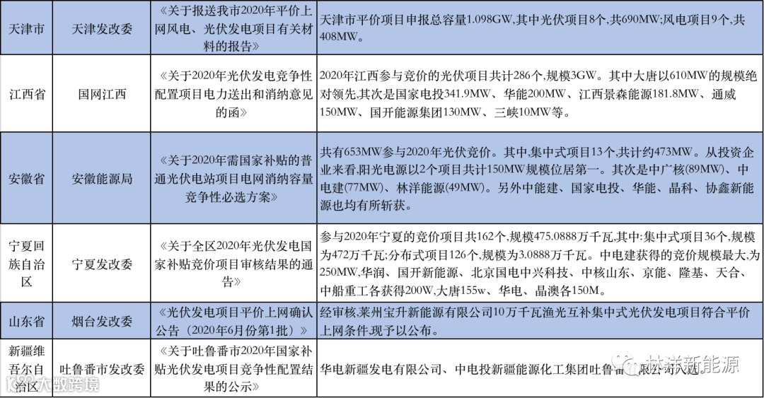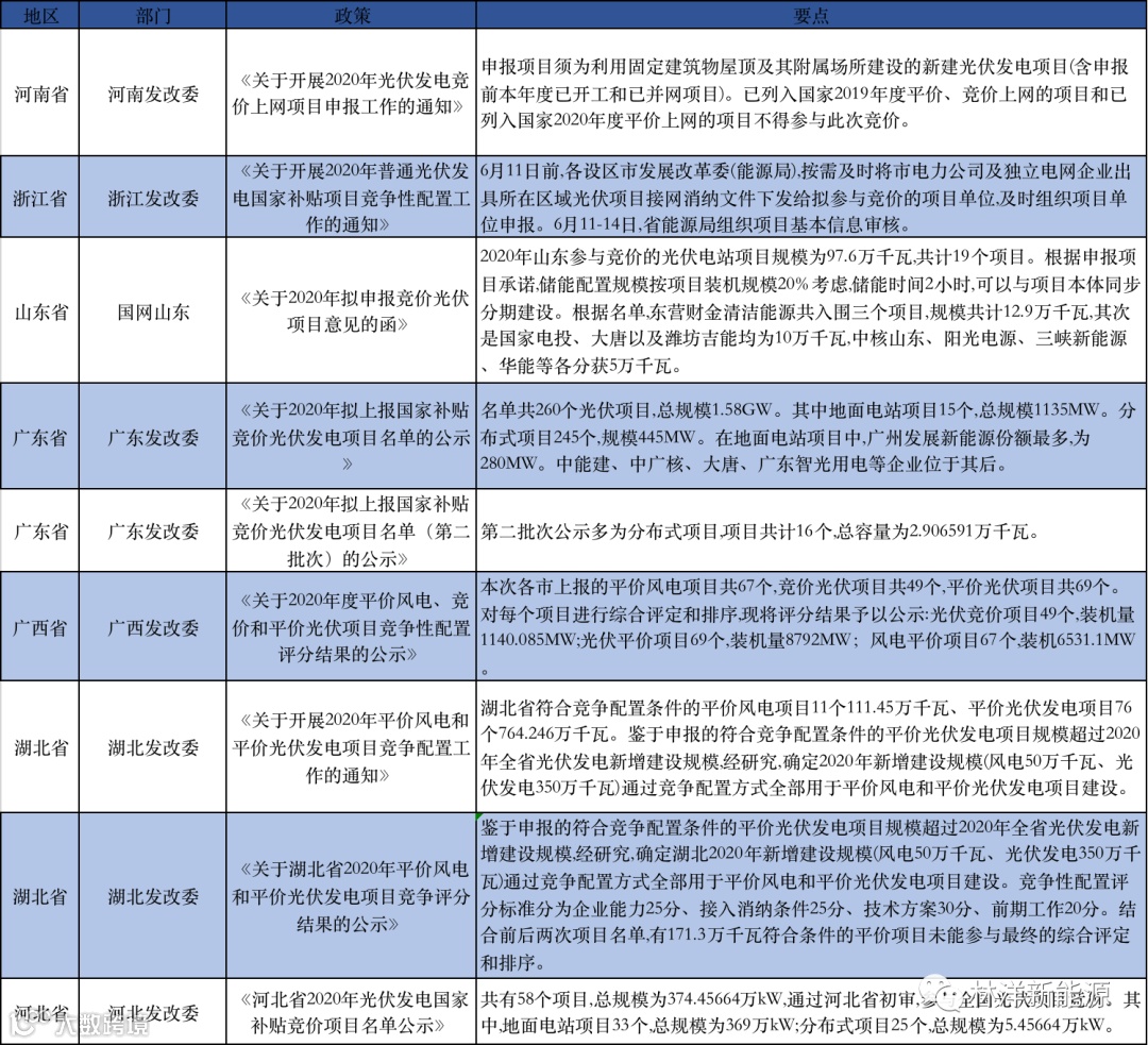 根据今年3月国家能源局发布的《2020年风电、光伏发电项目建设有关事项的通知》,2020年竞价项目组织申报延期至6月15日,因此近来多个省份、地区密集出台竞价上网相关政策。