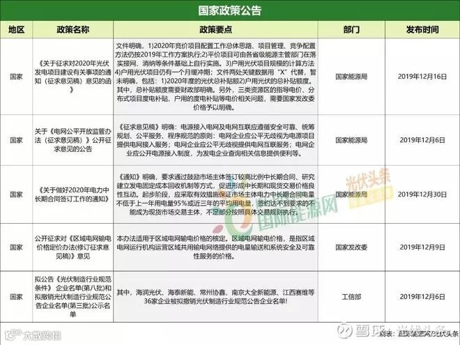国家:出台光伏相关新政策5条;除了国家能源局发布的《关于征求对2020年光伏发电项目建设有关事项的通知(征求意见稿)意见的函》,还有其下达的关于《电网公平开放监管办法(征求意见稿)》公开征求意见的公告也给了光伏人干下去的信心。