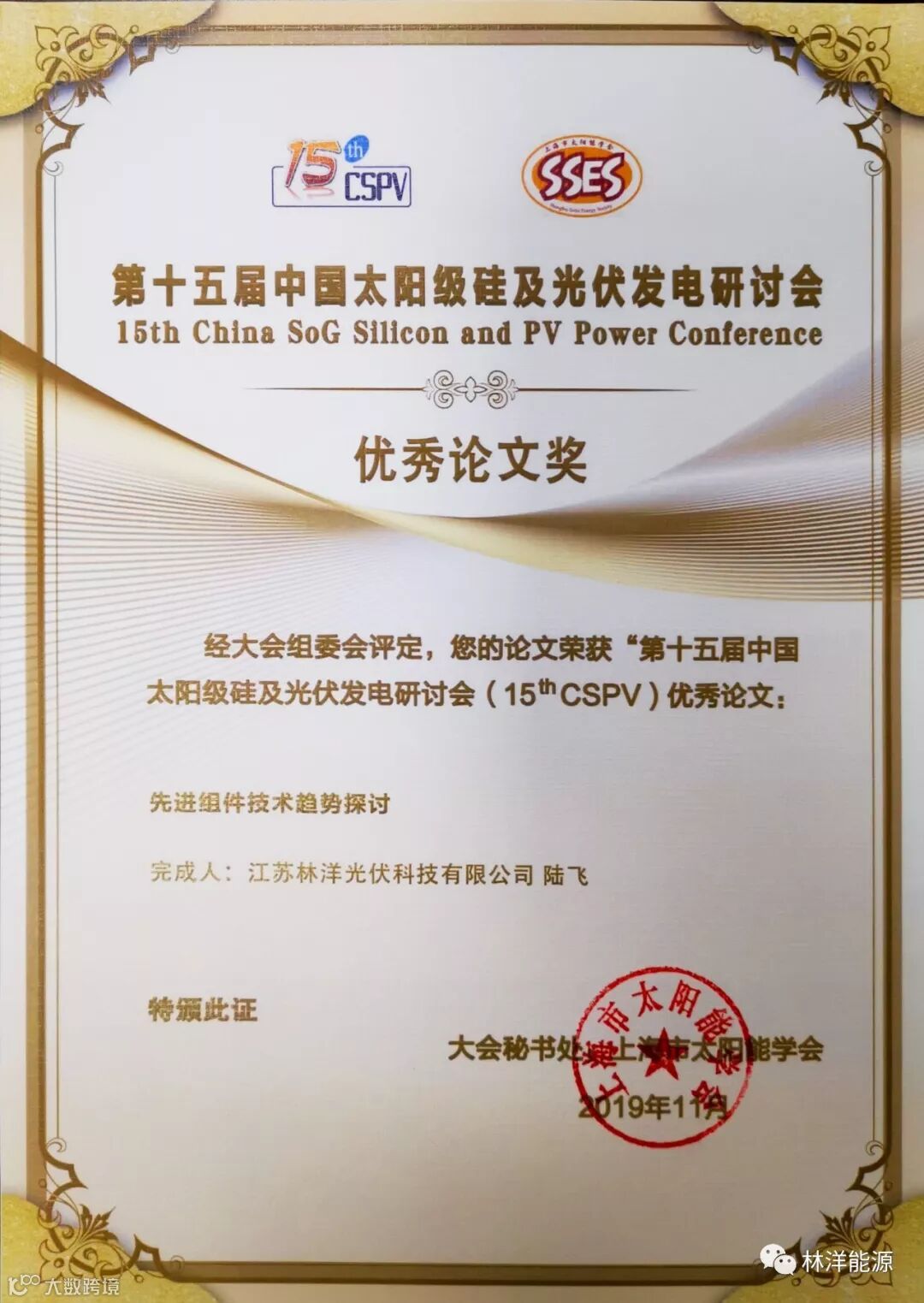 上月,第十五届中国太阳级硅及光伏发电研讨会(15th CSPV)在上海隆重召开!大会吸引了国内外的行业专家、政府代表和知名企业人士出席并报告了行业新进展、新工业、新成果,会议学术氛围强。在会议结束后的论文评选中,林洋光伏组件技术部总监陆飞凭借对先进组件技术趋势深入的探讨荣获“优秀论文奖”。