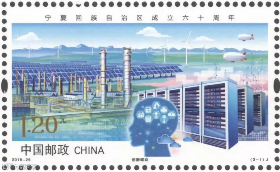 随后,在中国邮政于2018年9月19日发行的《宁夏回族自治区成立六十周年》纪念邮票中,又出现了光伏的身影。该套邮票1套3枚,邮票图案名称分别为:创新驱动、脱贫富民、生态立区,邮票全套面值3.60元。其中,3枚邮票中有2枚再次展现光伏元素!