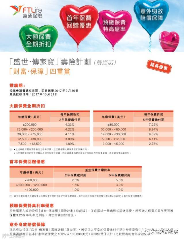 【盛世传家宝】寿险计划(尊尚版)保费回赠四重赏,除了可获得全期保费折扣外,首年更可额外获得保费回赠优惠;2年期首年最高回赠6.33%,5年期首年最高回赠12.22%,预缴更可获得保证3.25%之利息,可以说,富通的活动力度是最大的,也是最有诚意的。