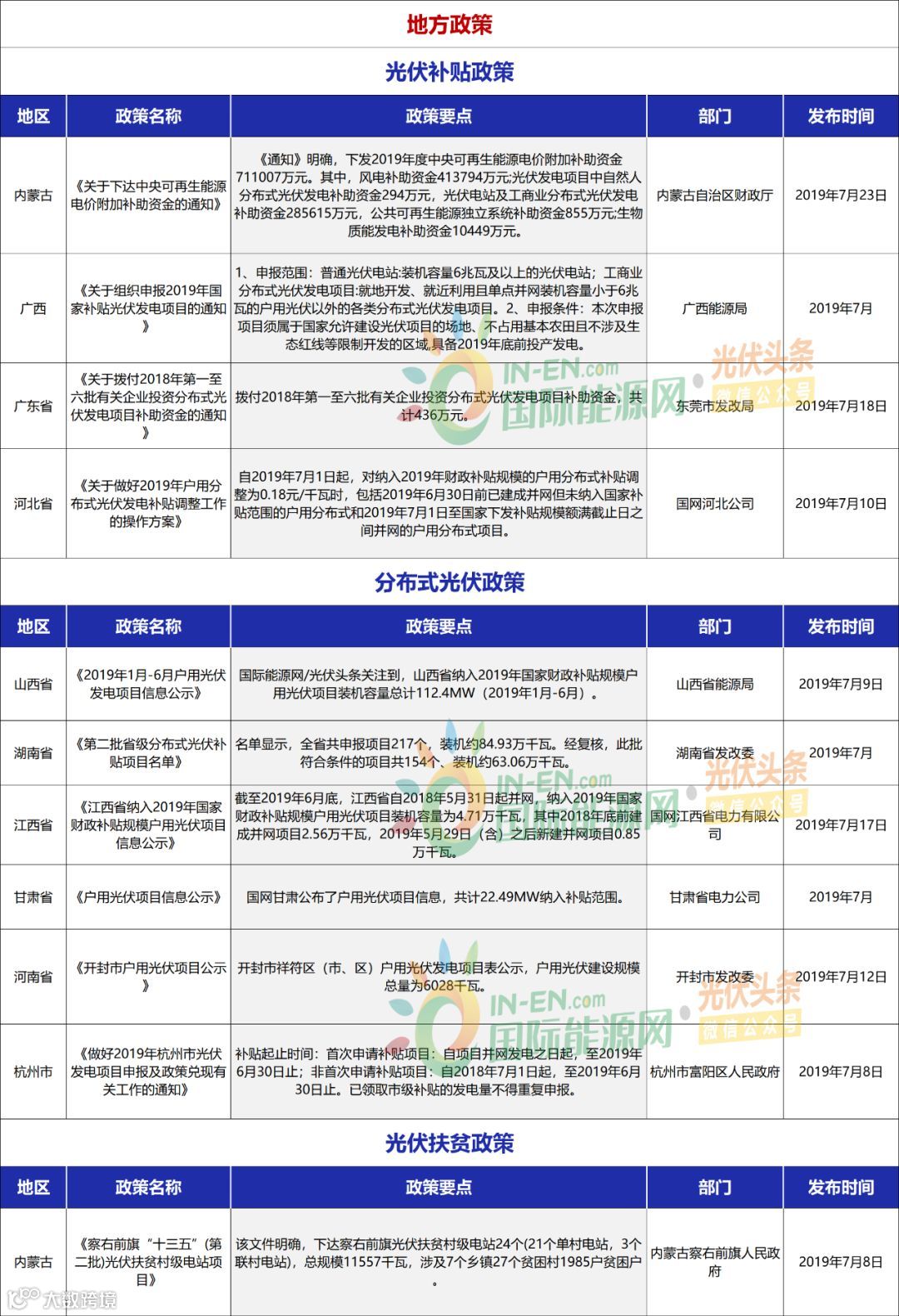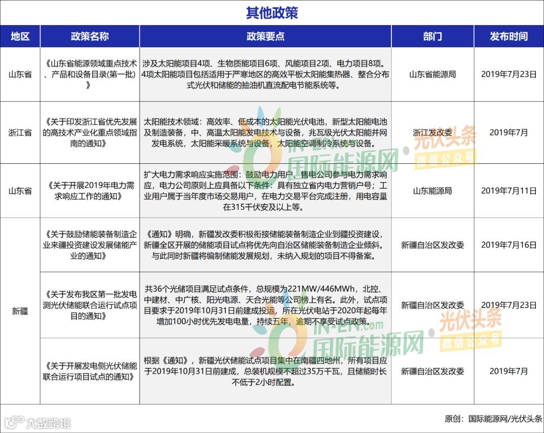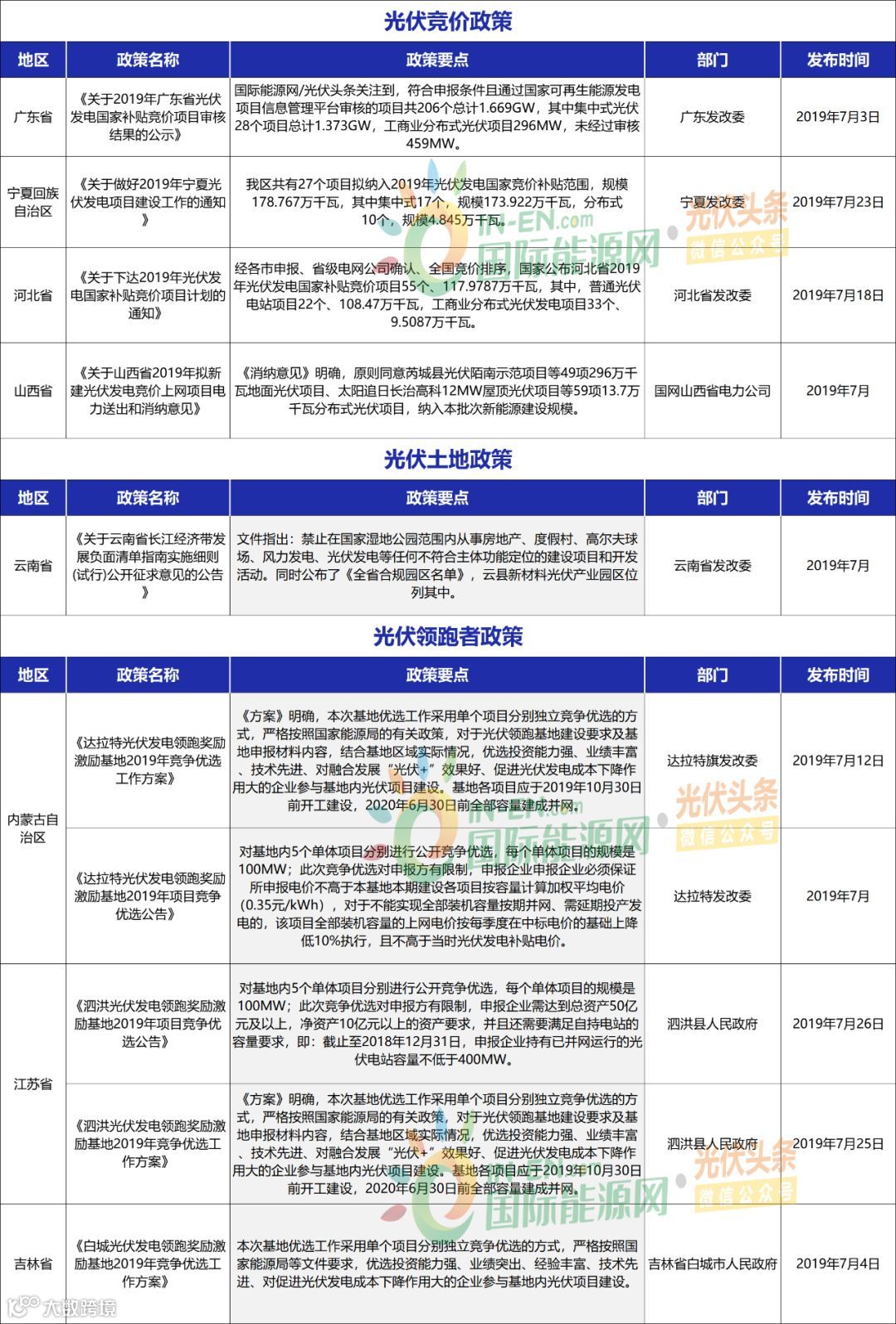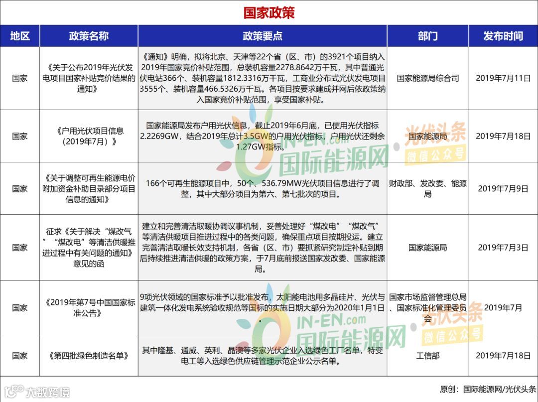 国家:出台光伏相关新政策6条;除了上述拟纳入2019年国家竞价补贴范围的项目名单发布之外,7月18日,国家能源局公布户用光伏信息,明确截止2019年6月底,已使用光伏指标2.2269GW,结合2019年总计3.5GW的户用光伏指标,户用光伏还剩余1.27GW指标,做户用光伏的人士需要抓紧抢装!