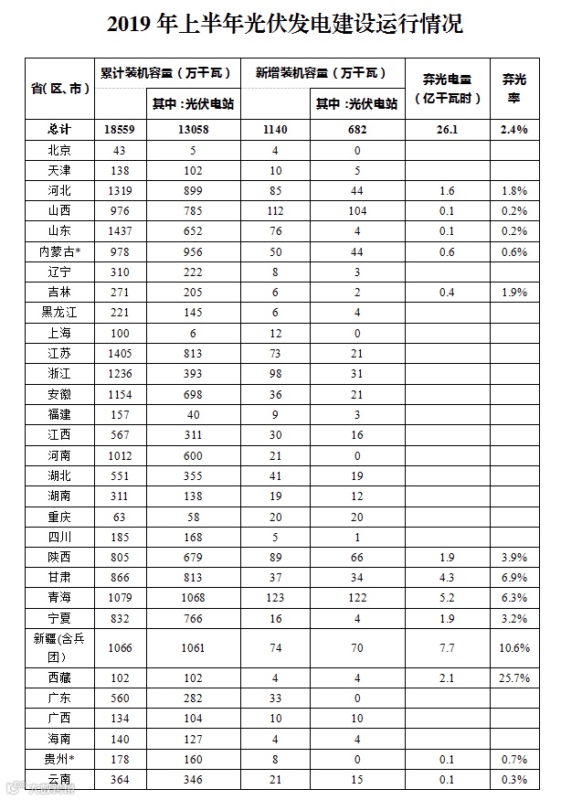 全国各省(区、市)2019年上半年光伏发电建设运行情况详见附表。