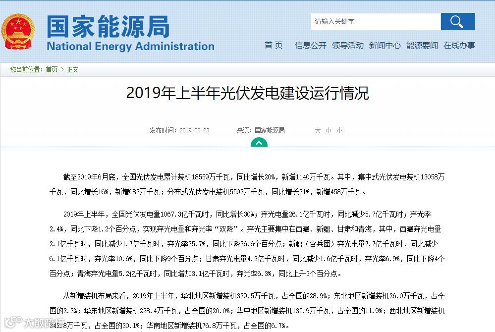 刚刚,国家能源局官方网站发布了2019年上半年光伏发电建设运行情况。显示:截至2019年6月底,全国光伏发电累计装机18559万千瓦,同比增长20%,新增1140万千瓦。其中,集中式光伏发电装机13058万千瓦,同比增长16%,新增682万千瓦;分布式光伏发电装机5502万千瓦,同比增长31%,新增458万千瓦。