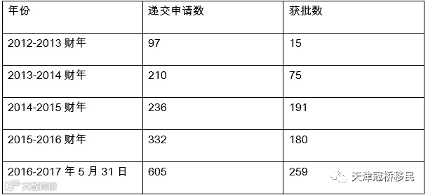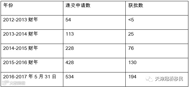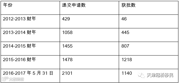 截止到2017年5月31日,188A签证的递交总数为6521个,获批的签证数量为3656个。从2012-2013财年新政正式实施,188A签证的申请人数逐年稳步上升,截止到上一个财年,申请数量已经增长了将近4倍。