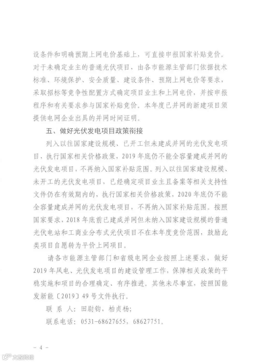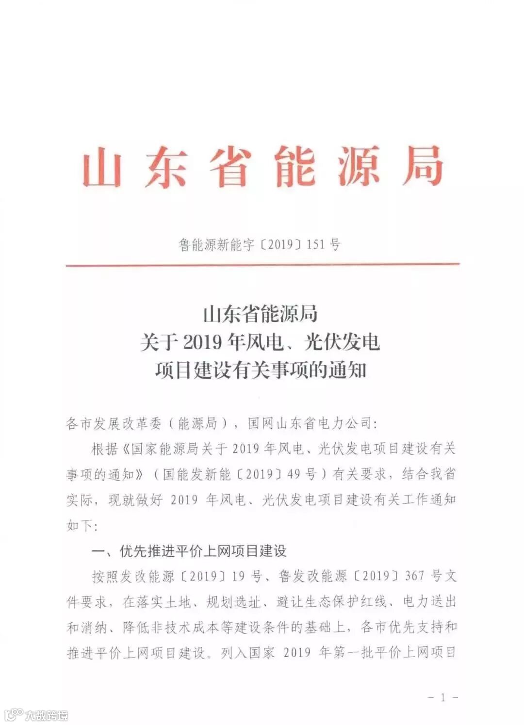 发文标题:《山东省能源局关于2019年风电、光伏发电项目建设有关事项的通知》