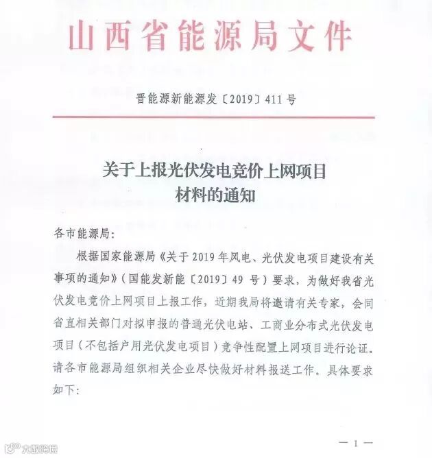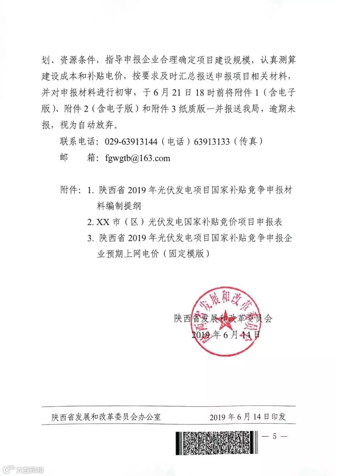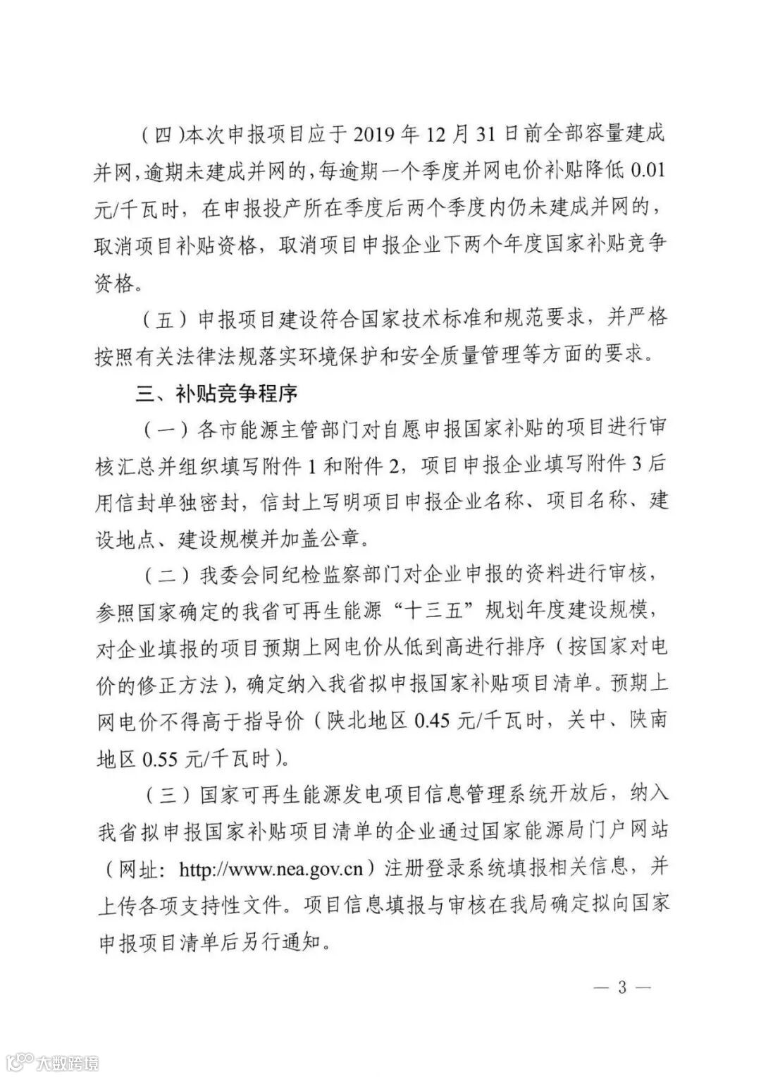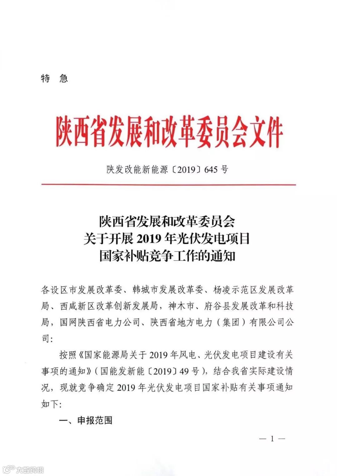 发文标题:《陕西省发展和改革委员会关于开展2019年光伏发电项目国家补贴竞争工作的通知》