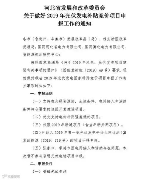 发文标题:《河北省发展和改革委员会关于做好 2019 年光伏发电补贴竞价项目申报工作的通知》