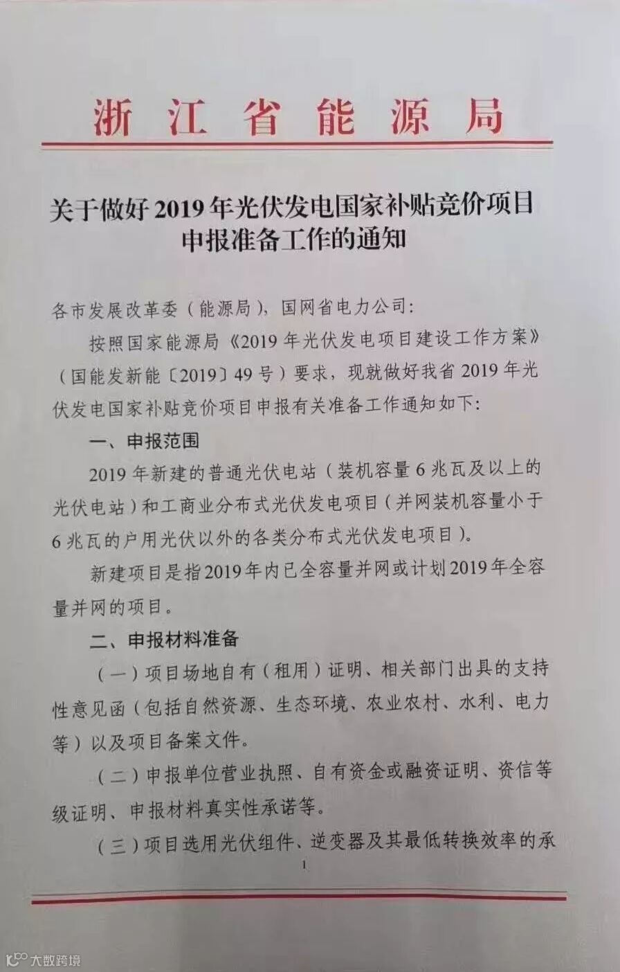 发文标题:《关于做好2019年光伏发电项目国家补贴竞争项目申报准备工作的通知》