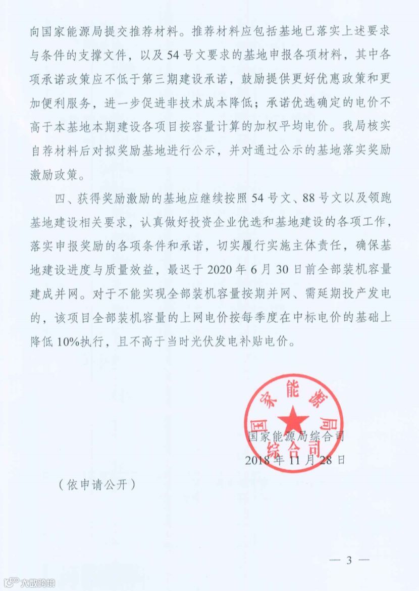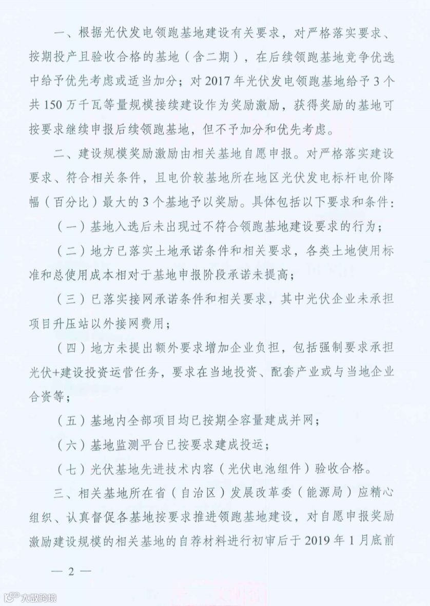 近日,国家能源局综合司发布《关于光伏发电领跑基地奖励激励有关事项的通知》,对于严格落实要求、按期投产且验收合格的基地(含二期)在后续领跑基地竞争优选中给予优先考虑或适当加分;对2017年光伏发电基地给予3个共150万千瓦等量规模连续建设作为奖励激励。