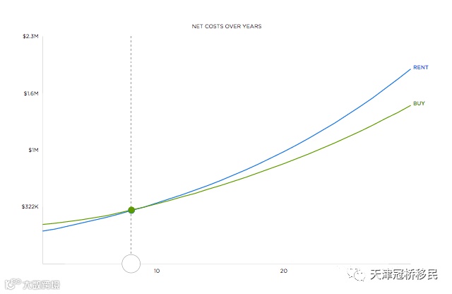图中两条线的交接点的时间为第8年,则表示这个时间点买房成本与租房成本相同。因此,前8年租房划算,8年之后则买房划算。