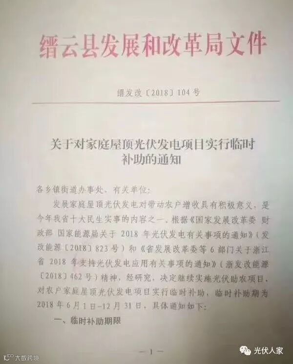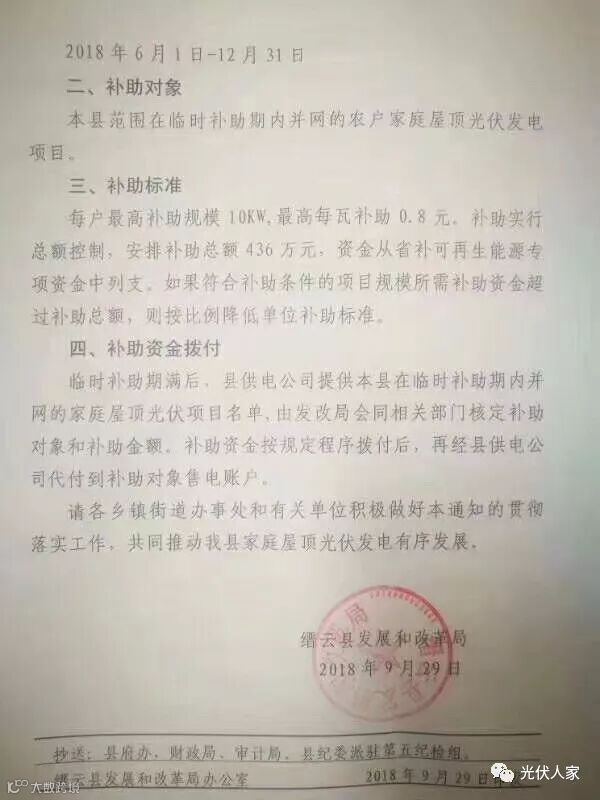 9月29日,县发改局下发了《关于对家庭屋顶光伏发电项目实行临时补助的通知》。对本县范围在2018年6月1日-12月31日期间并网的农户家庭屋顶光伏发电项目实行临时补助。