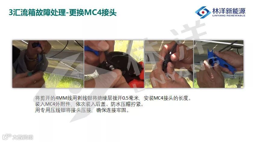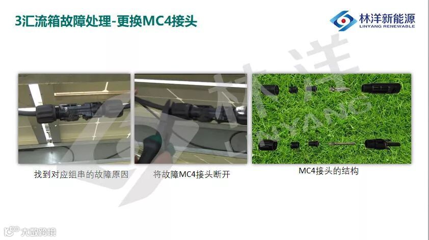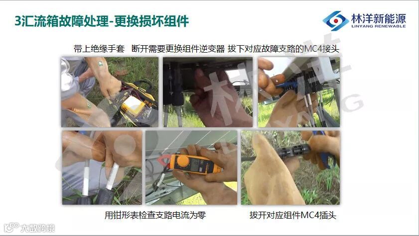 本章节针对汇流箱的主要组成部件的故障排查及更换急性详细讲解,主要有:1、熔丝;2、MC4接头;3、组串电流低;4、更换通讯模块;5、更换空开;6、485通讯线等。并结合现场故障处理的图片来更直观的讲授面对这些故障时该如何处理。示例: