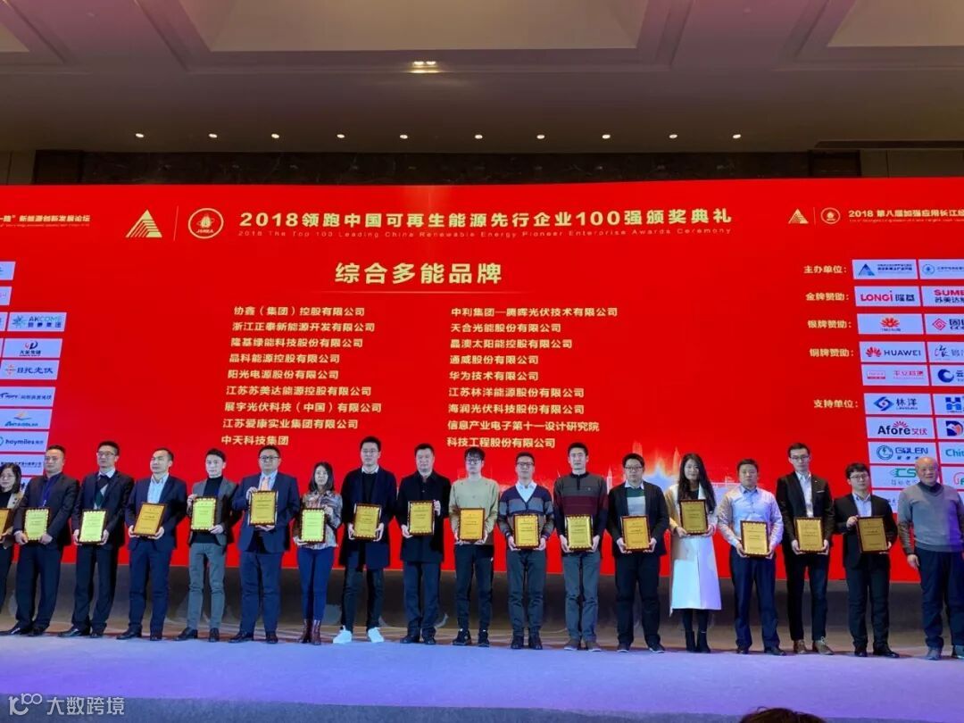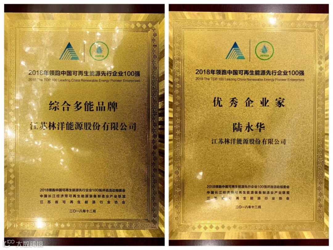作为本次论坛的重要环节,大会晚宴期间举行了隆重的2018领跑中国可再生能源先行企业100强颁奖典礼。继今年获得的多项荣誉之后,林洋再次凭借良好的公司实力和品牌影响力斩获由江苏省可再生能源行业协会颁发的“2018领跑中国可再生能源先行企业第一军团100强之综合多能品牌奖”,同时,林洋集团总裁、林洋能源董事长陆永华荣膺“优秀企业家”殊荣。