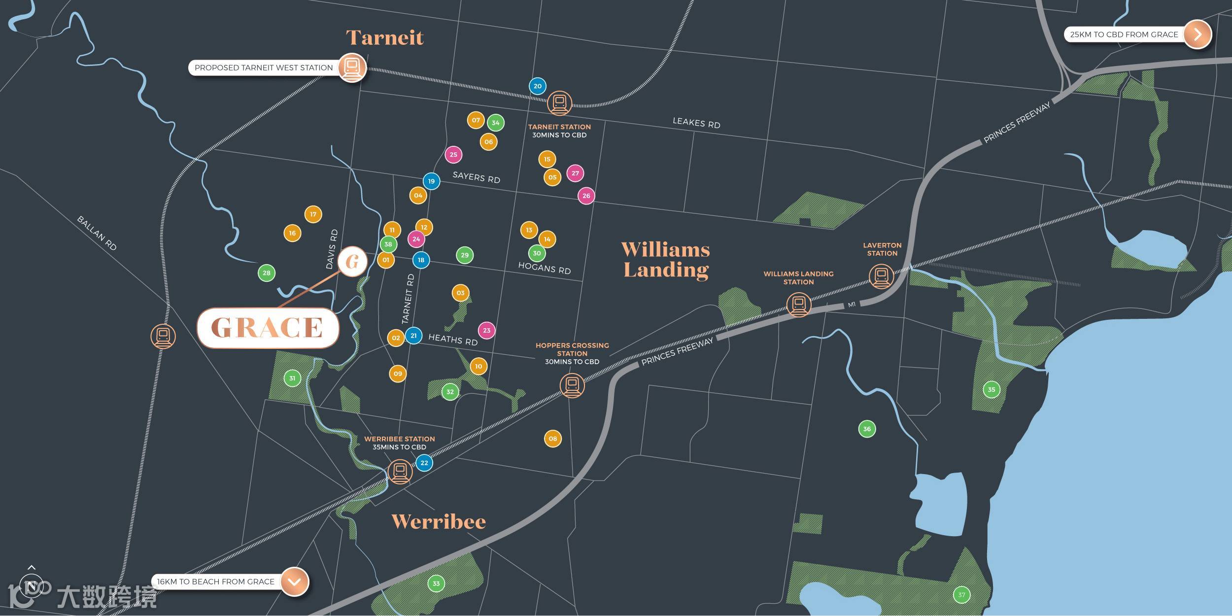 Grace地处墨尔本西南区Tarneit,距离墨尔本Collins St 25KM。位于Davis河和Werribee河之间,是一个藏在繁忙都市背后的宁静的世外桃源。多个的自然保育园围绕着小区,让您有足够的空间放松心情。漫步在沿河小道让你忘掉就在身旁的闹市。