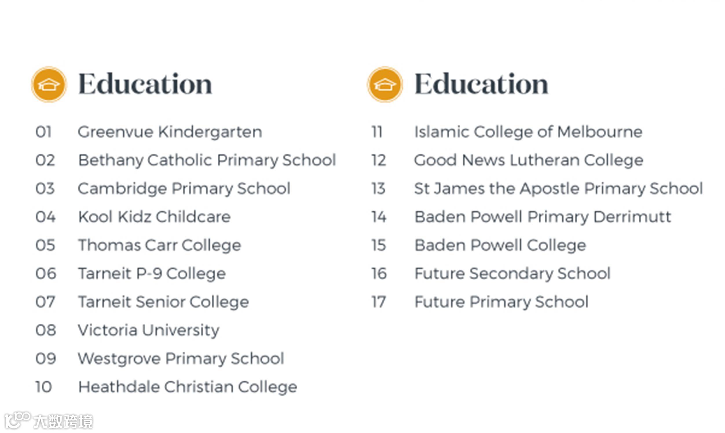 墨尔本西区Werribee将建造一个大学城,预计斥资300亿澳元,计划容纳8万居民,为4万学生提供从中学到职业教育到大学的优质教育。Werribee区还设有维多利亚分校和墨尔本大学。