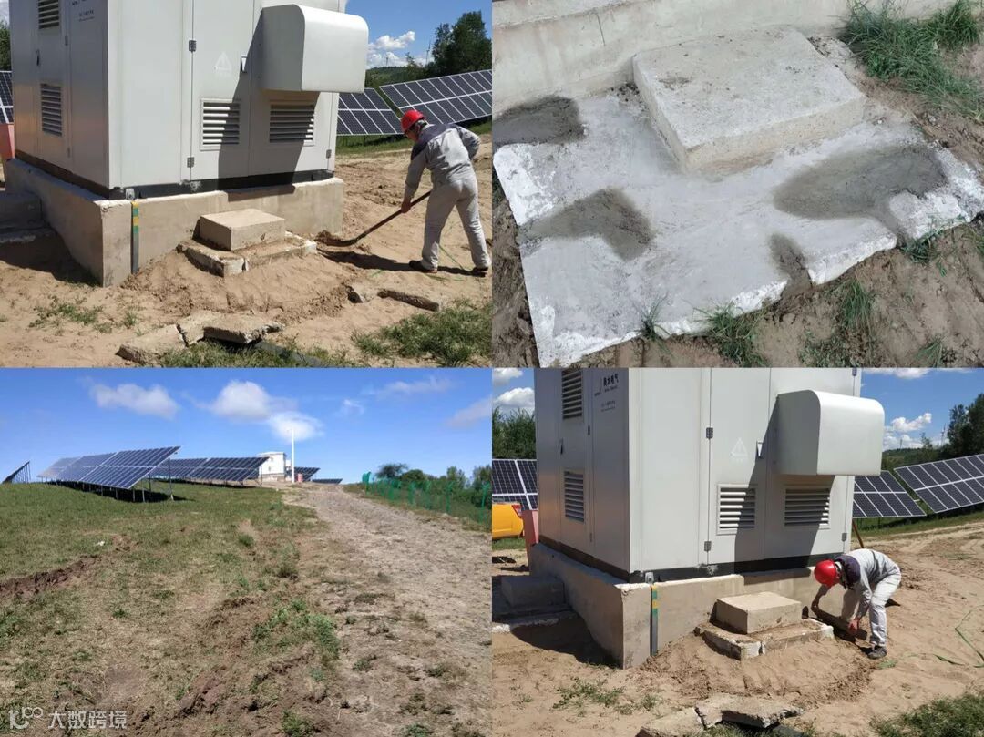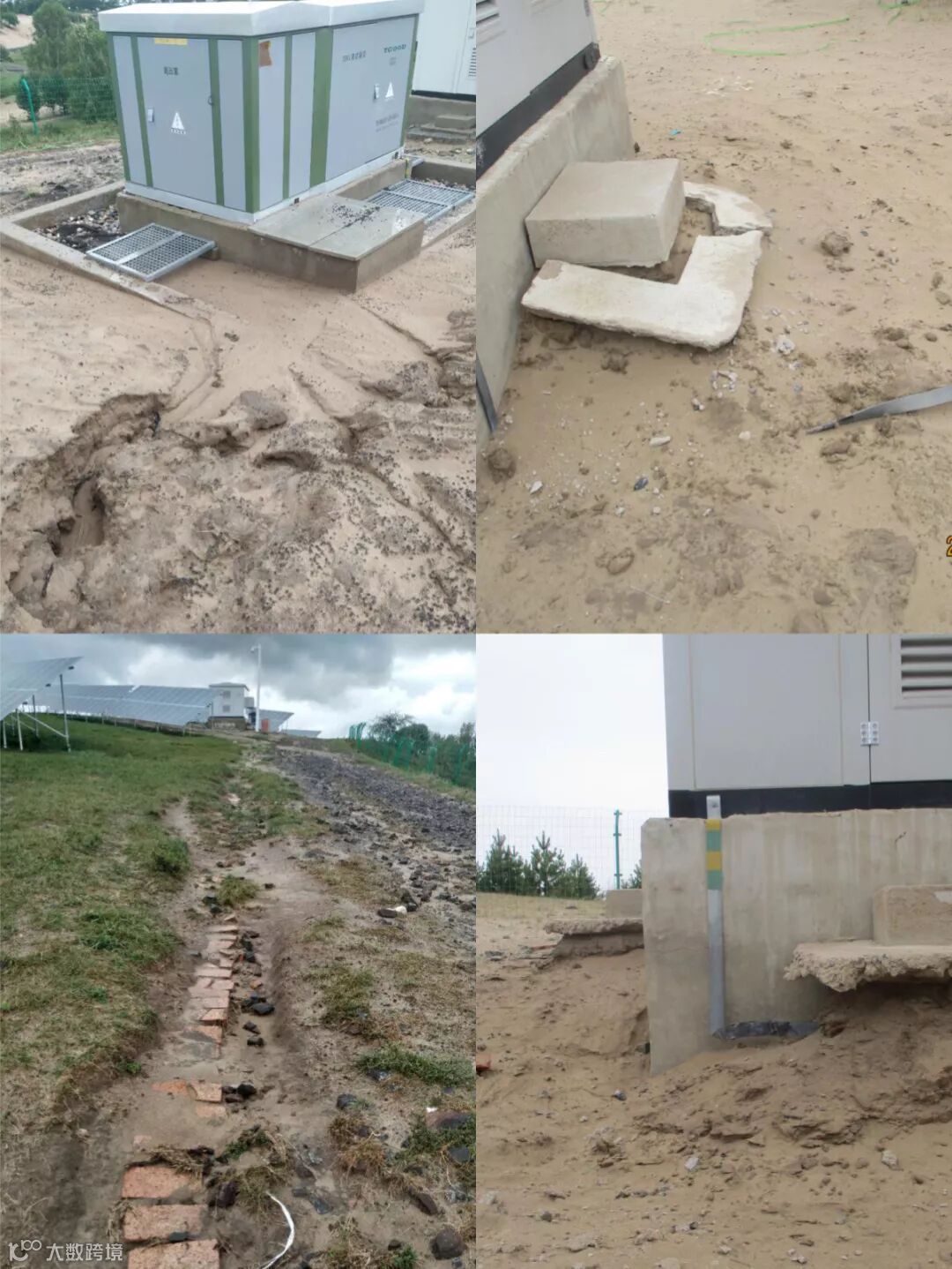 由于坝上属于高原地区,属于沙漠地带,风蚀水流造成水土流失严重,逆变器台阶、箱变基础渗油池、组串支架均遭到不同程度的破坏。在8月份我站集中排查隐患,对水土流失严重的部位进行加固处理,我站全体员工顶着酷暑搬砖、和水泥(水泥是在隔壁站要的)进行加固。已初步阻挡了风沙雨水对逆变、箱变、组件的侵蚀。