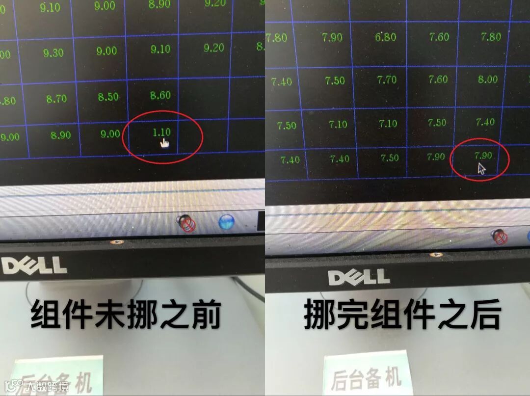 2018年8月30日,特殊专用工具制作完成,经过实验、调试。于9月5日正式开始挪移遮挡组件,在张站长的带领下全站运维员工(留一人值守电站)到光伏区,通过测量、筛选最终确定新的组件安装地点,为了不损失发电量,采取拆除半架安装半架的方式,经过粗略计算第一天一串组串抢发电量:8.25kwh,经过6天加班加点的人工钻装,组装支架,安装光伏组件,终于在2018年9月10日11:30分完成全部移挪组件工程。经过后台和现场电流观察,由原来的1.1A提升到峰值9.2A。预计每天每串提高发电量6kwh。合计三串一年可多发6570kwh,25年可发164250kwh。