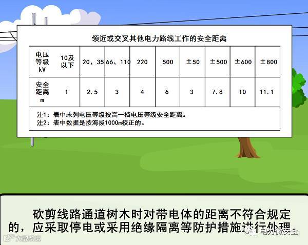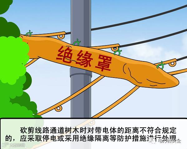 (1)砍剪线路通道树木时对带电体的距离不符合表中规定的,应采取停电或采用绝缘隔离等防护措施进行处理。