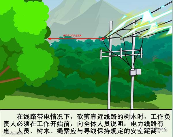 (2)在线路带电情况下,砍剪靠近线路的树木时,工作负责人必须在工作开始前,向全体人员说明:电力线路有电,人员、树木、绳索应与导线保持规定的安全距离。
