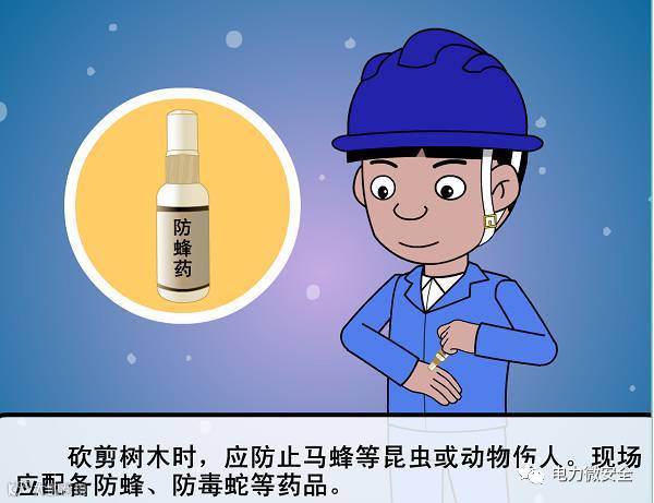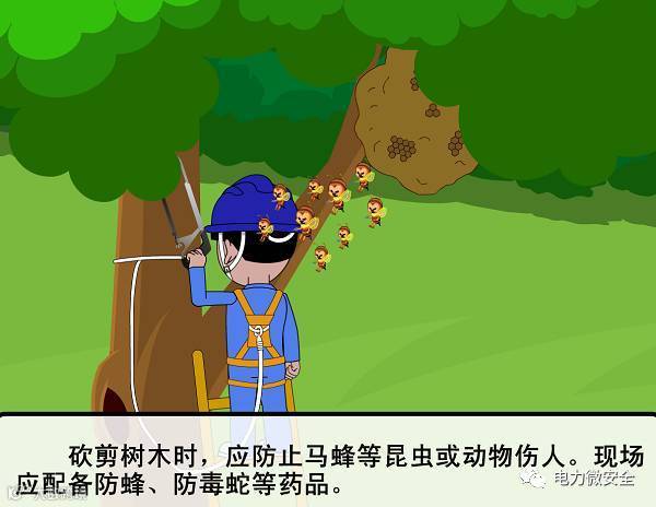 (8)砍剪树木时,应防止马蜂等昆虫或动物伤人。现场应配备防蜂、防毒蛇等药品。