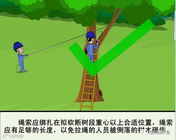 (6)为防止树木倒落在导线上,应设法用绳索将其拉向与导线相反的方向。绳索应绑扎在拟砍断树段重心以上合适位置,绳索应有足够的长度,以免拉绳的人员被倒落的树木砸伤。
