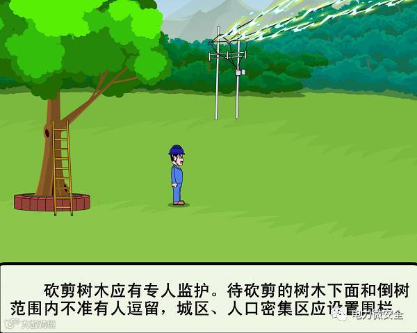 2018年7月26日,输电所在清理500kV西马线165#塔树障时,由于树木倒下过程中与导线距离不足,导致导线树木放电,线路跳闸重合成功。现场参与树障清理的一名民工被电孤灼伤(轻伤)。本次事件构成有责任的电力人身四级事件。为使大家能够吸取教训,避免类似事故再次发生,再次回顾一下砍树的正确姿势: