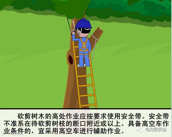 (9)砍剪树木的高处作业应按要求使用安全带。安全带不准系在待砍剪树枝的断口附近或以上。具备高空车作业条件的,宜采用高空车进行辅助作业。