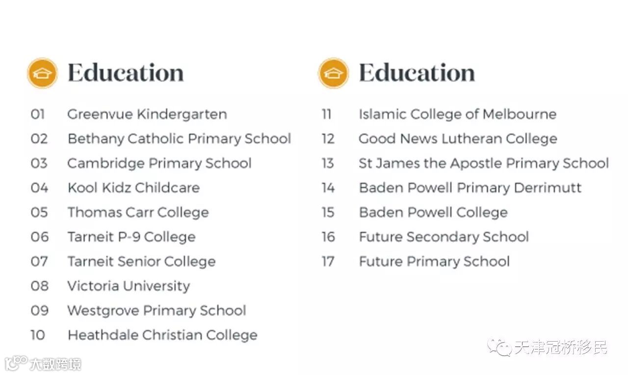 墨尔本西区Werribee将建造一个大学城,预计斥资300亿澳元,计划容纳8万居民,为4万学生提供从中学到职业教育到大学的优质教育。Werribee区还设有维多利亚分校和墨尔本大学。