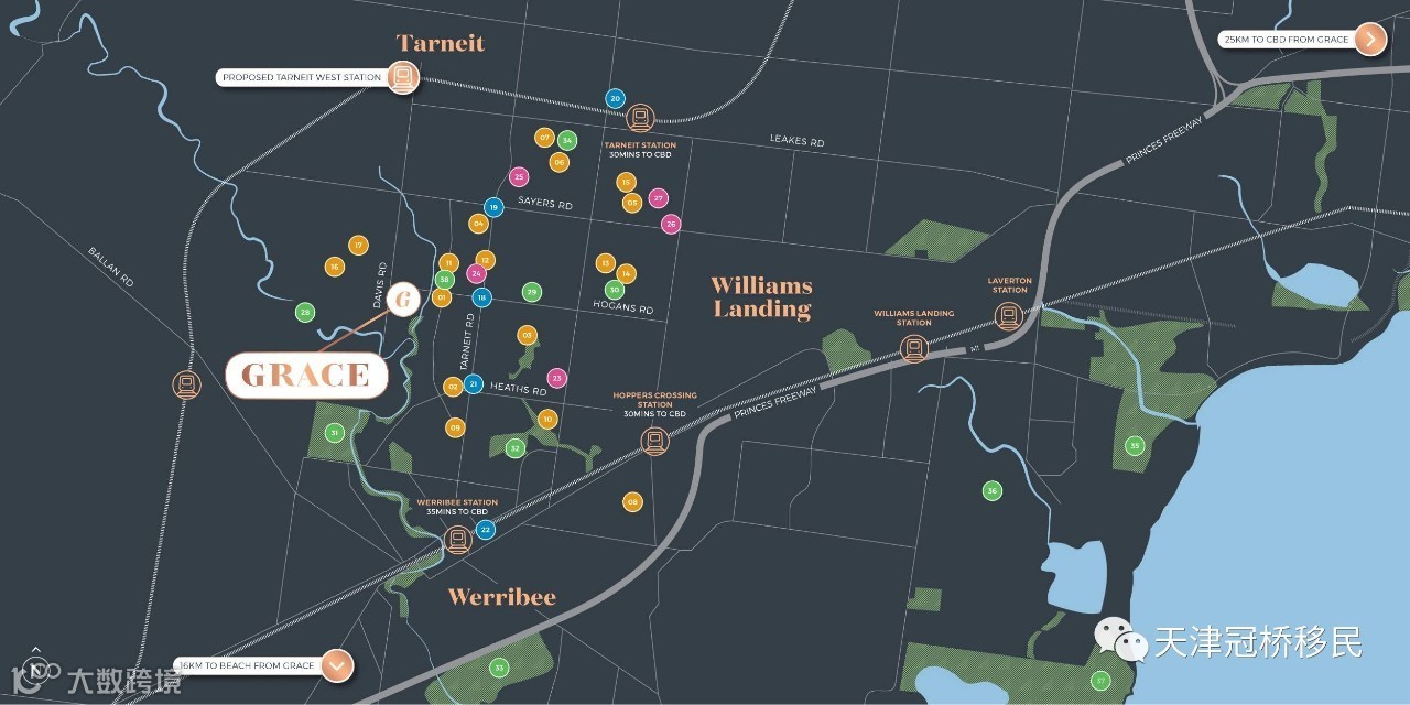巴士,火车,高速公路多种途径让你方便来往Collins St。离该项目6km的tarneit火车站,乘4站V/Line火车直达墨尔本市区。并且,距离“墨尔本第二个CBD”east werribee 5km。