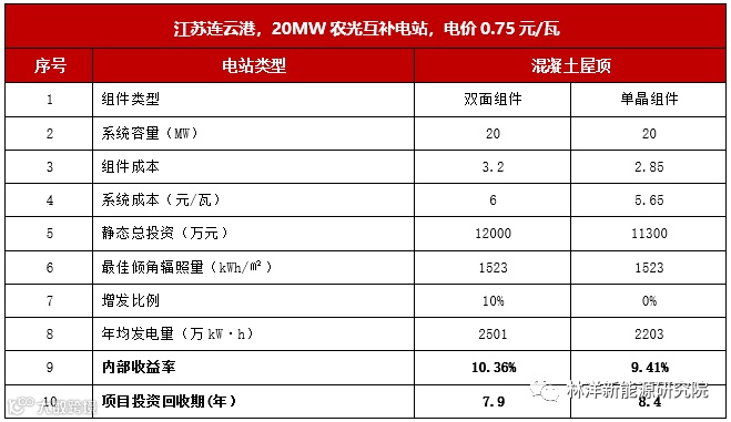 由图3可见,在普通地面电站场景下,N型双面组件的增发比例区间为[6%,14.5%]。本次技经分析选取的连云港某20MW农光互补项目的实际地面条件,经实地测量该项目的N型双面组件的增发比例为10%。两种组件安装方案的系统成本分别为6元/瓦、5.65元/瓦,经过计算收益结果如下表: