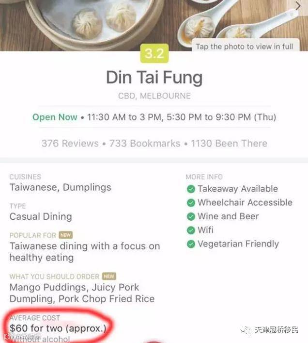 墨尔本的鼎泰丰2人价是60澳币,人均30澳币 ,占一天收入的23%。